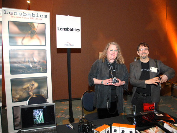 Kirsten Hunter (left), Director of Customer Happiness and Sam Pardue (right), Co-CEO of Lensbabies pose for pictures during Pepcom's DigitalFocus event during the recent PMA 2006 trade show.